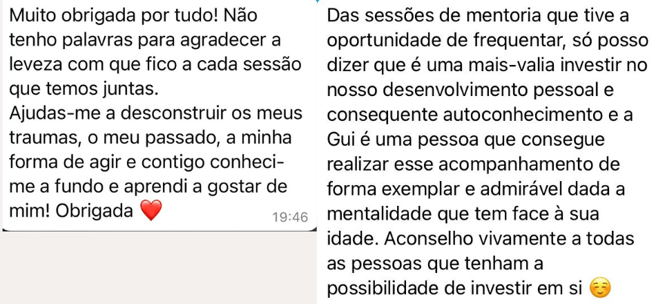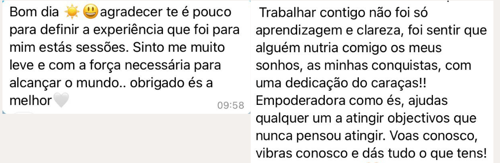 Apaixonada por Desenvolvimento Pessoal, a minha missão é ajudar as pessoas a alcançarem a sua melhor versão e viverem em alinhamento com seus valores e objetivos.