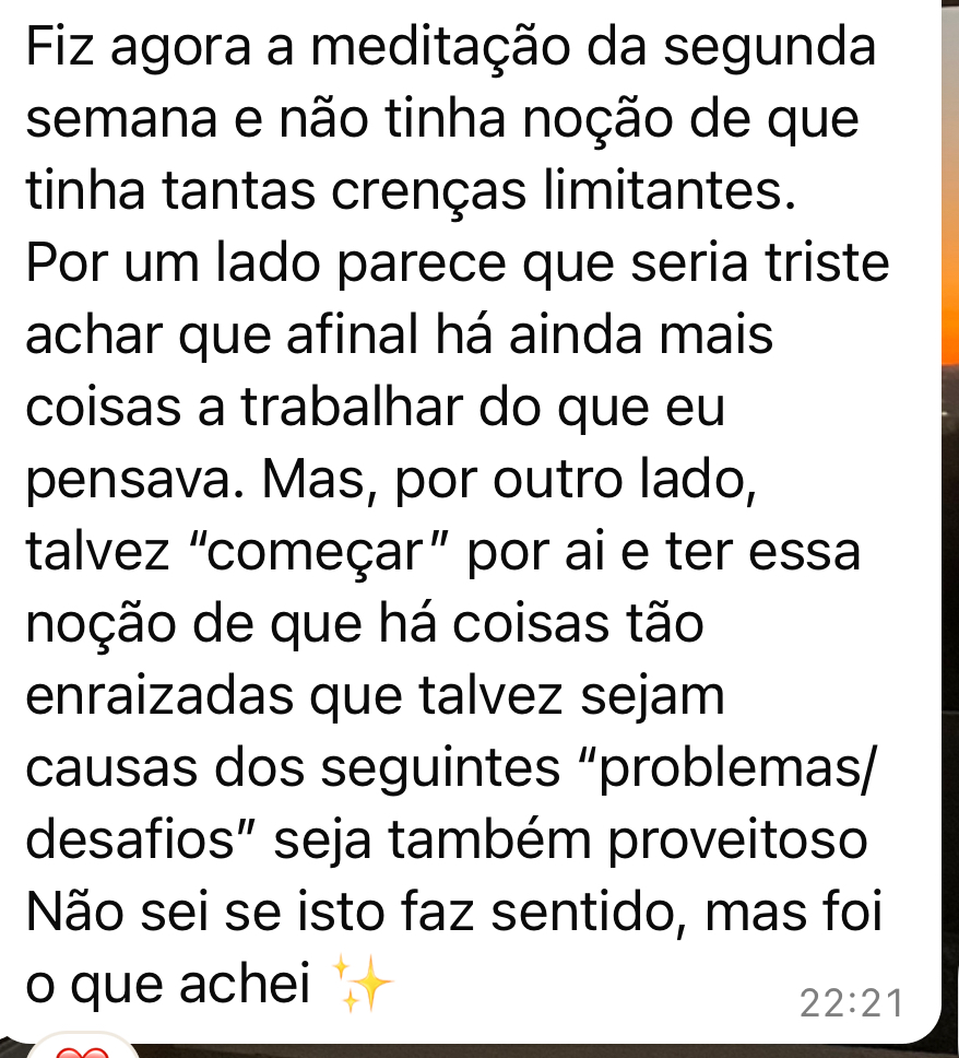 - 15 Meditações gravadas (acesso imediato) sobre diversos temas como conexão interior, amor próprio, autoconfiança, gratidão, relaxamento para dormir, perdão, entre outros.